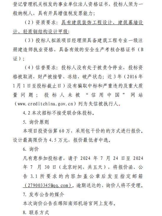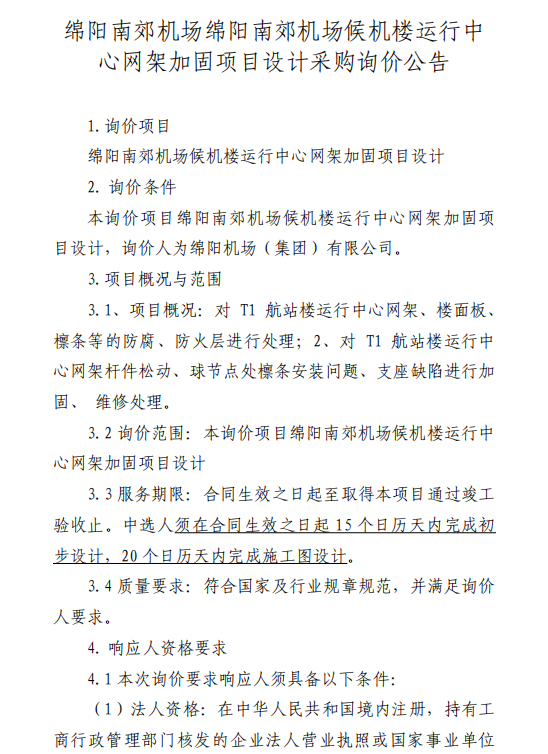 綿陽南郊機場綿陽南郊機場候機樓運行中心網(wǎng)架加固項目設(shè)計采購詢價公告