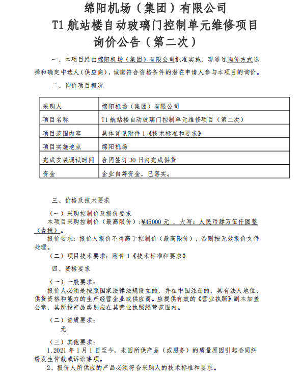 綿陽(yáng)機(jī)場(chǎng)(集團(tuán))有限公司 T1 航站樓自動(dòng)玻璃門控制單元維修項(xiàng)目詢價(jià)公告(第二次)