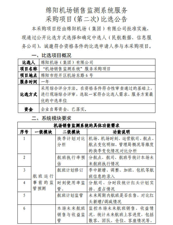 綿陽機(jī)場(chǎng)銷售監(jiān)測(cè)系統(tǒng)服務(wù)采購項(xiàng)目(第二次)比選公告