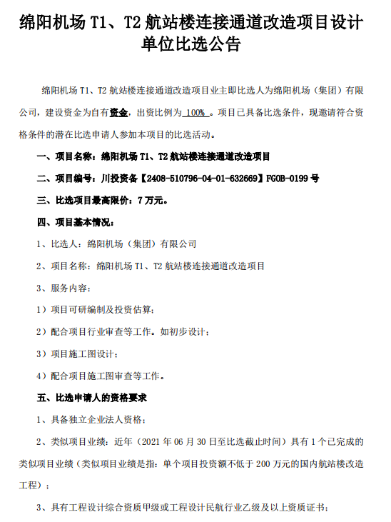 綿陽機場 T1、T2 航站樓連接通道改造項目設(shè)計單位比選公告