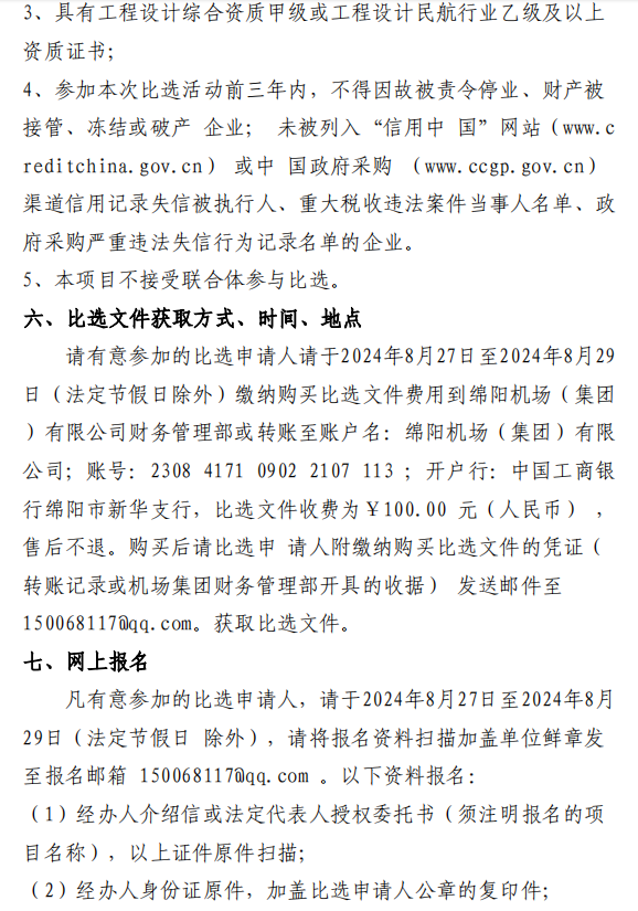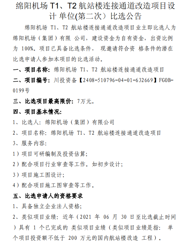綿陽機(jī)場 T1、T2 航站樓連接通道改造項目設(shè)計單位(第二次)比選公告