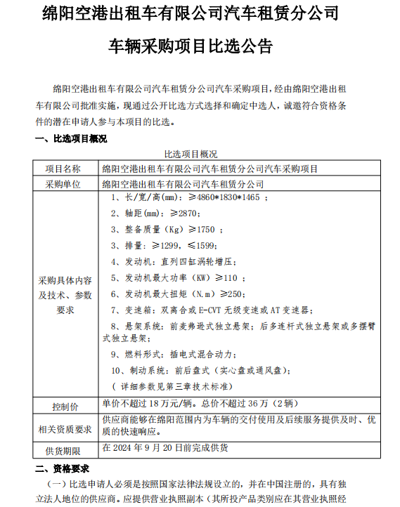 綿陽空港出租車有限公司汽車租賃分公司車輛采購項目比選公告