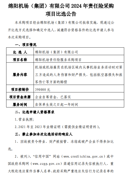 綿陽機(jī)場(集團(tuán))有限公司2024年責(zé)任險(xiǎn)采購項(xiàng)目比選公告